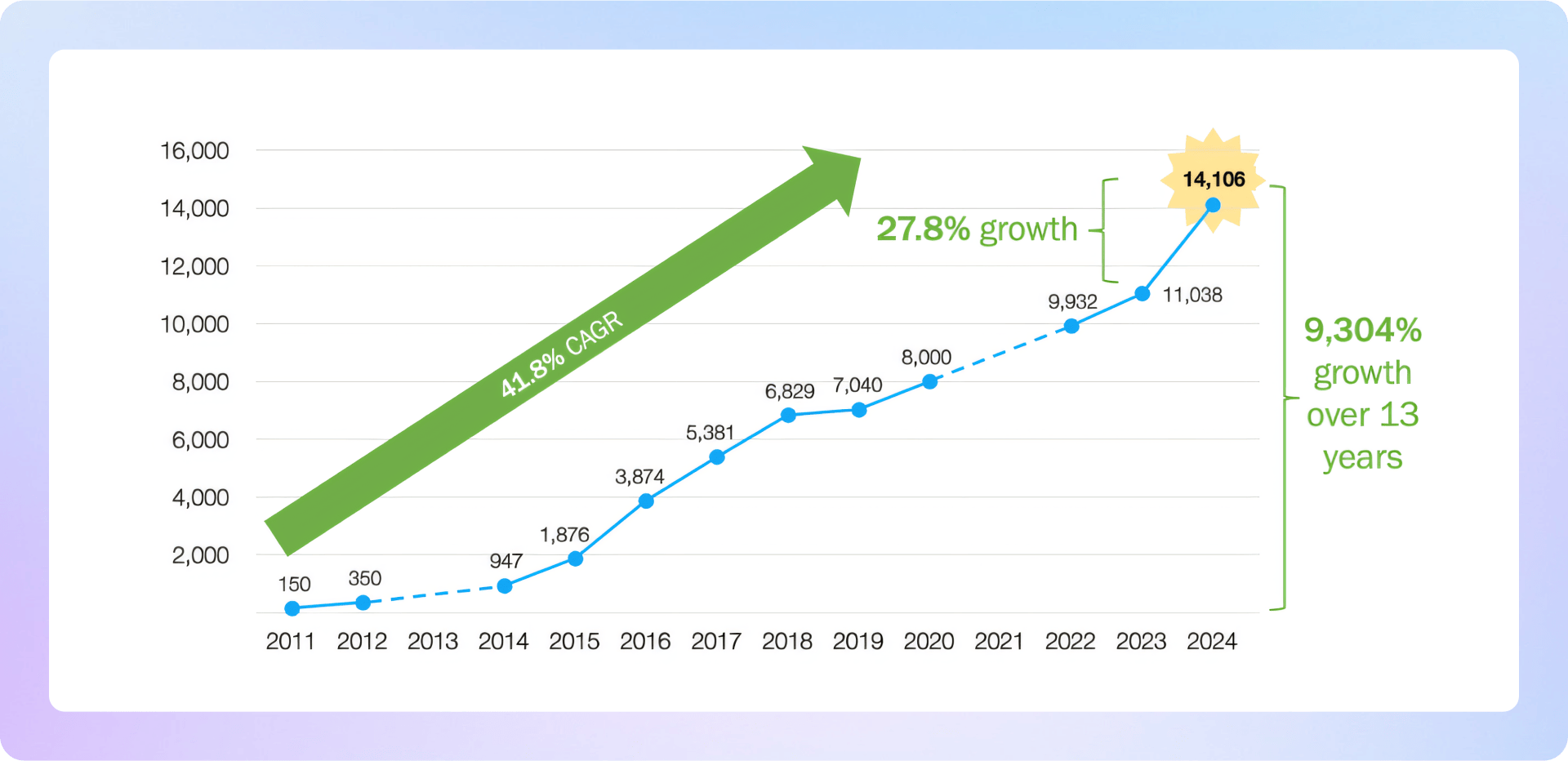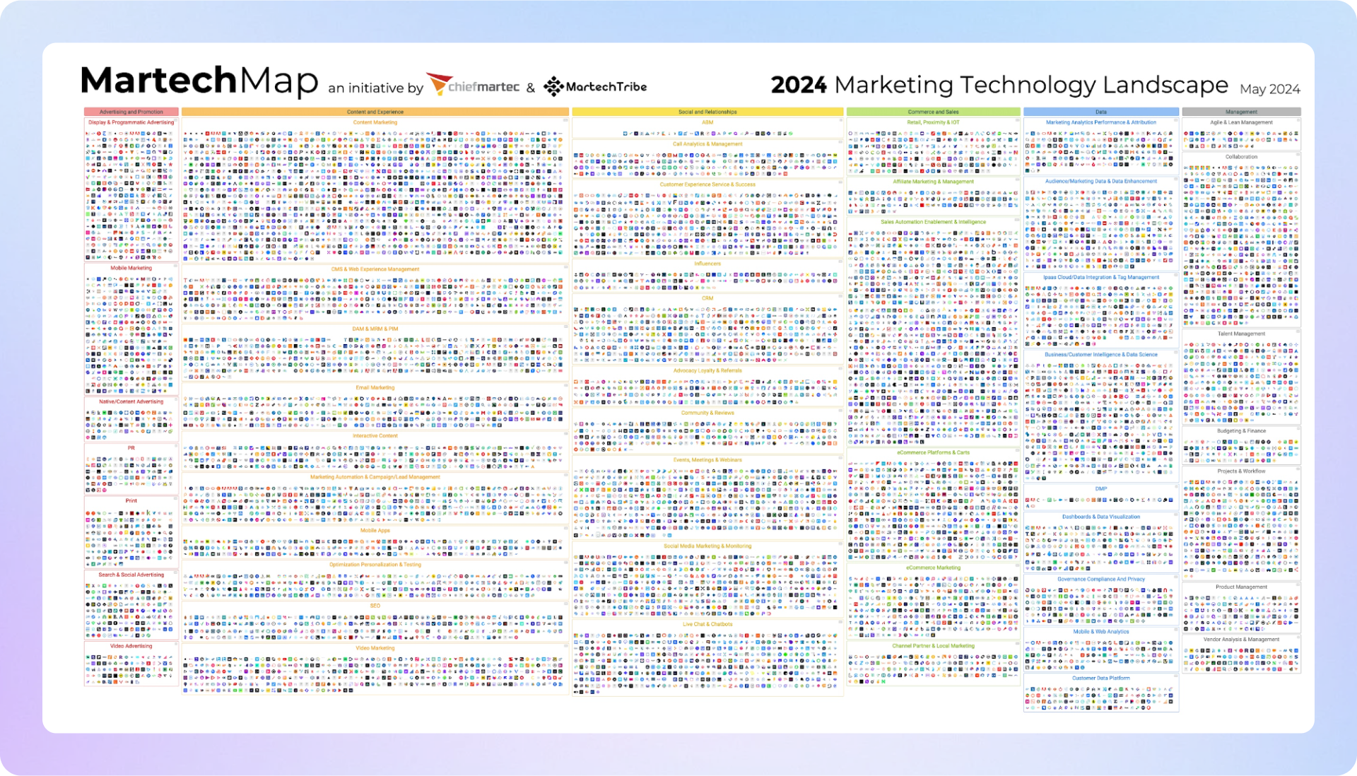 Рынок Marketing Technology растёт очень быстро. По данным chiefmartec за последние 13 лет количество маркетинговых технологий выросло на 9304% и к 2024 году составило более 14 тысяч продуктов: