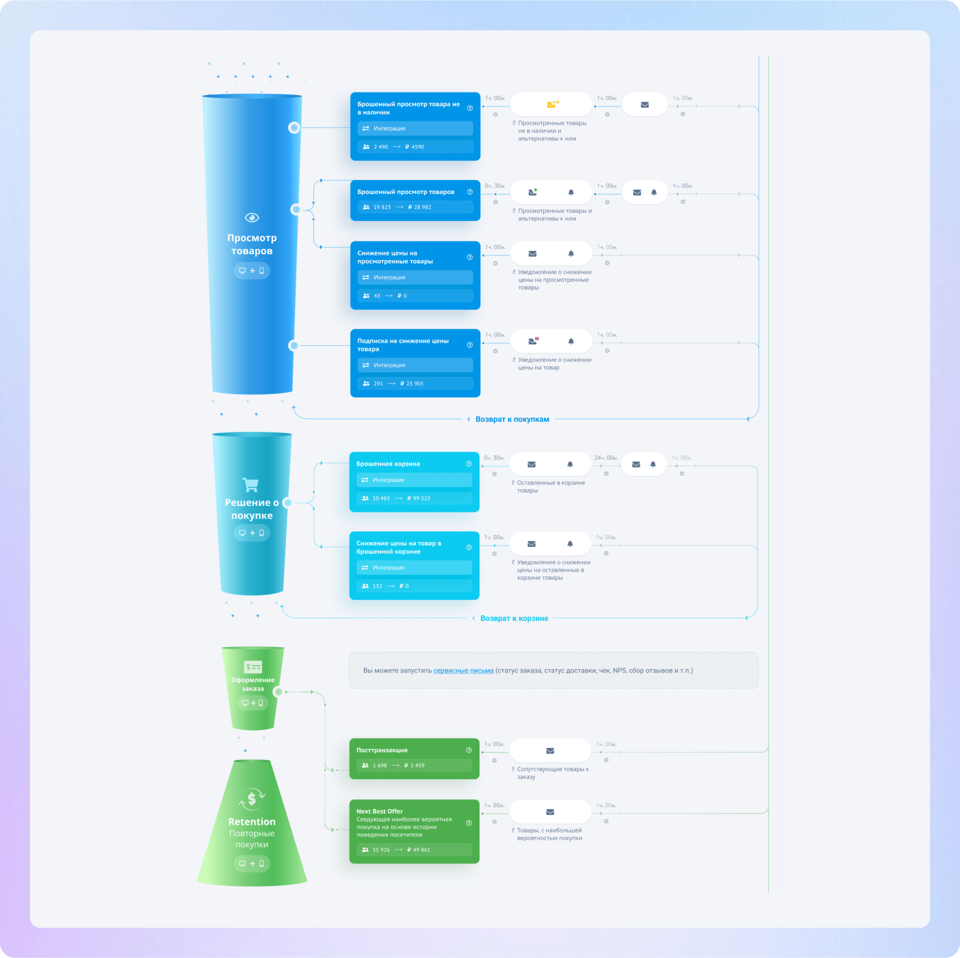 Автоматизация строится на тщательном планировании и глубоком понимании процессов. Нужно задать правила, по которым будут срабатывать автоматические инструменты. Если речь идёт об автоматизации коммуникаций, — разработать сценарии с условиями, при которых будет запускаться отправка сообщений.