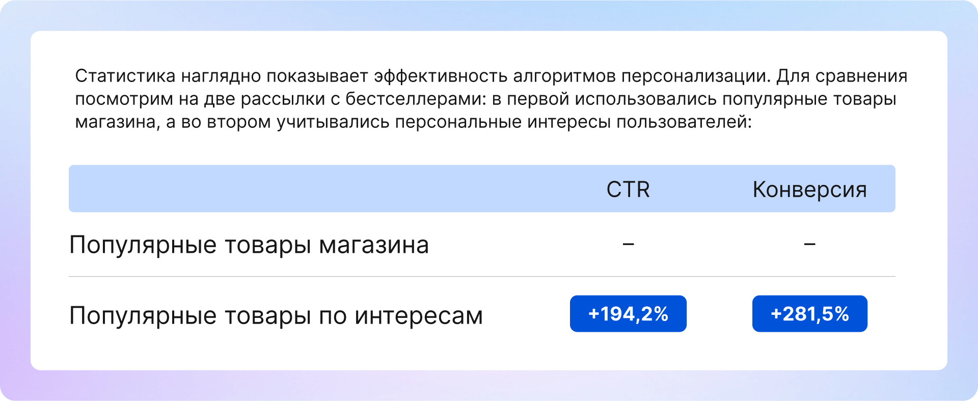Информация о клиенте, его интересах и пользовательском поведении помогает точнее попадать в его потребности, что увеличивает отклик от взаимодействия.