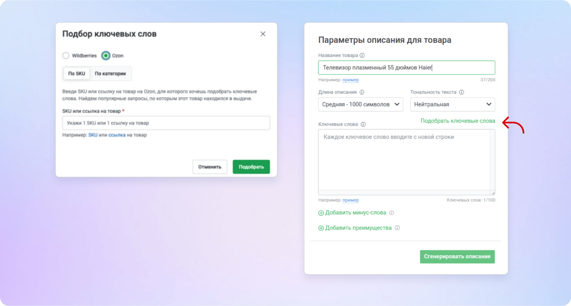 Пример AI-генератора описаний с подбором ключевых слов от сервиса MPSTATS