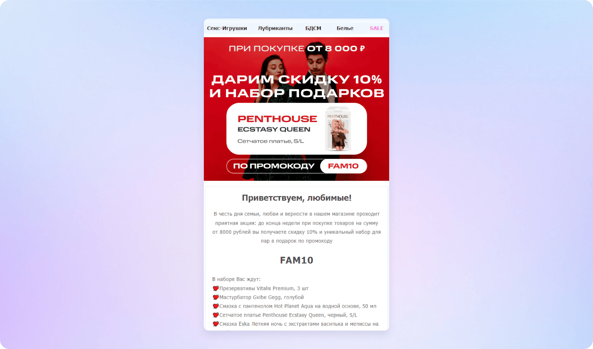 Пример массовой рассылки с промокодом на скидку от IntimShop