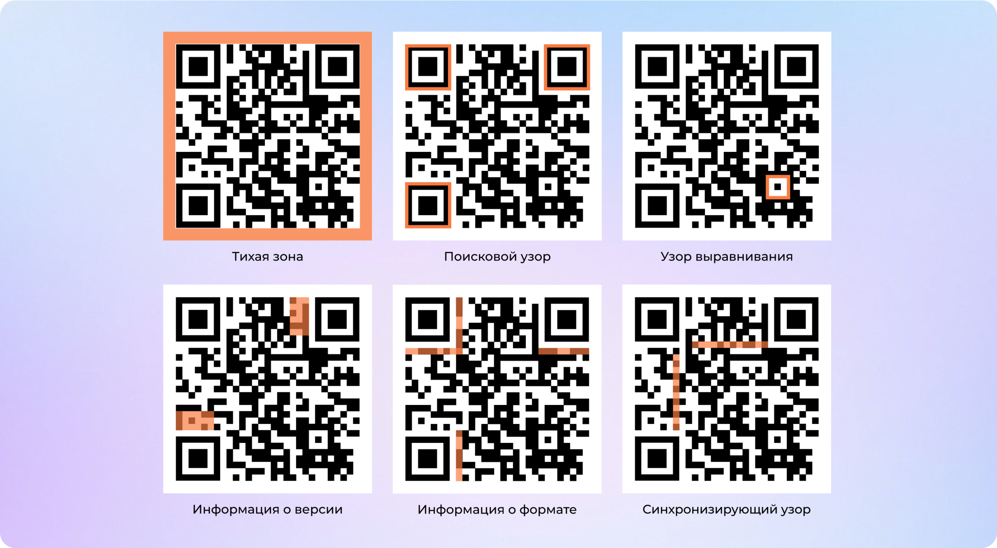 Поисковые узоры. Три крупных квадрата, которые расположены по углам. Они помогают сканеру ориентироваться и читать данные, независимо от положения кода.