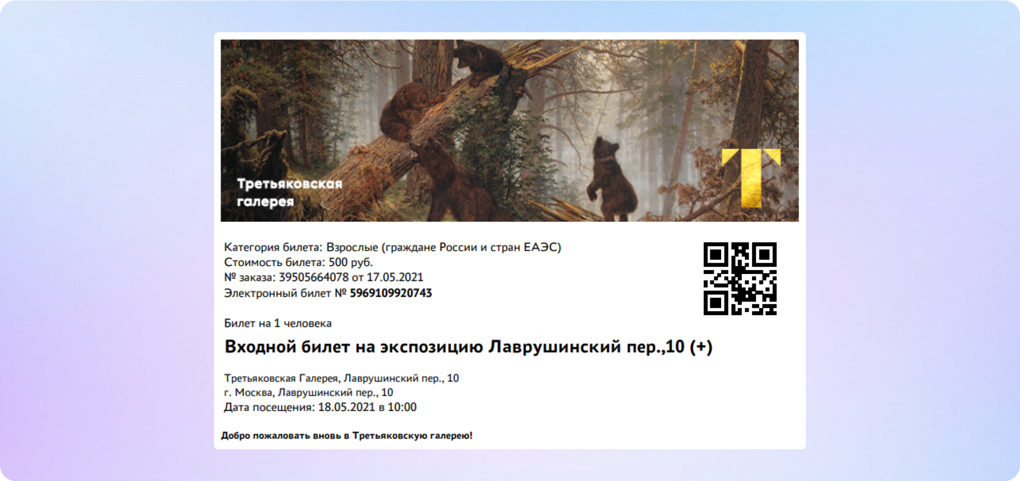 Двумерные коды наносят на электронные билеты концертов, театров, музеев и кино. Это упрощает контроль и ускоряет процесс входа.