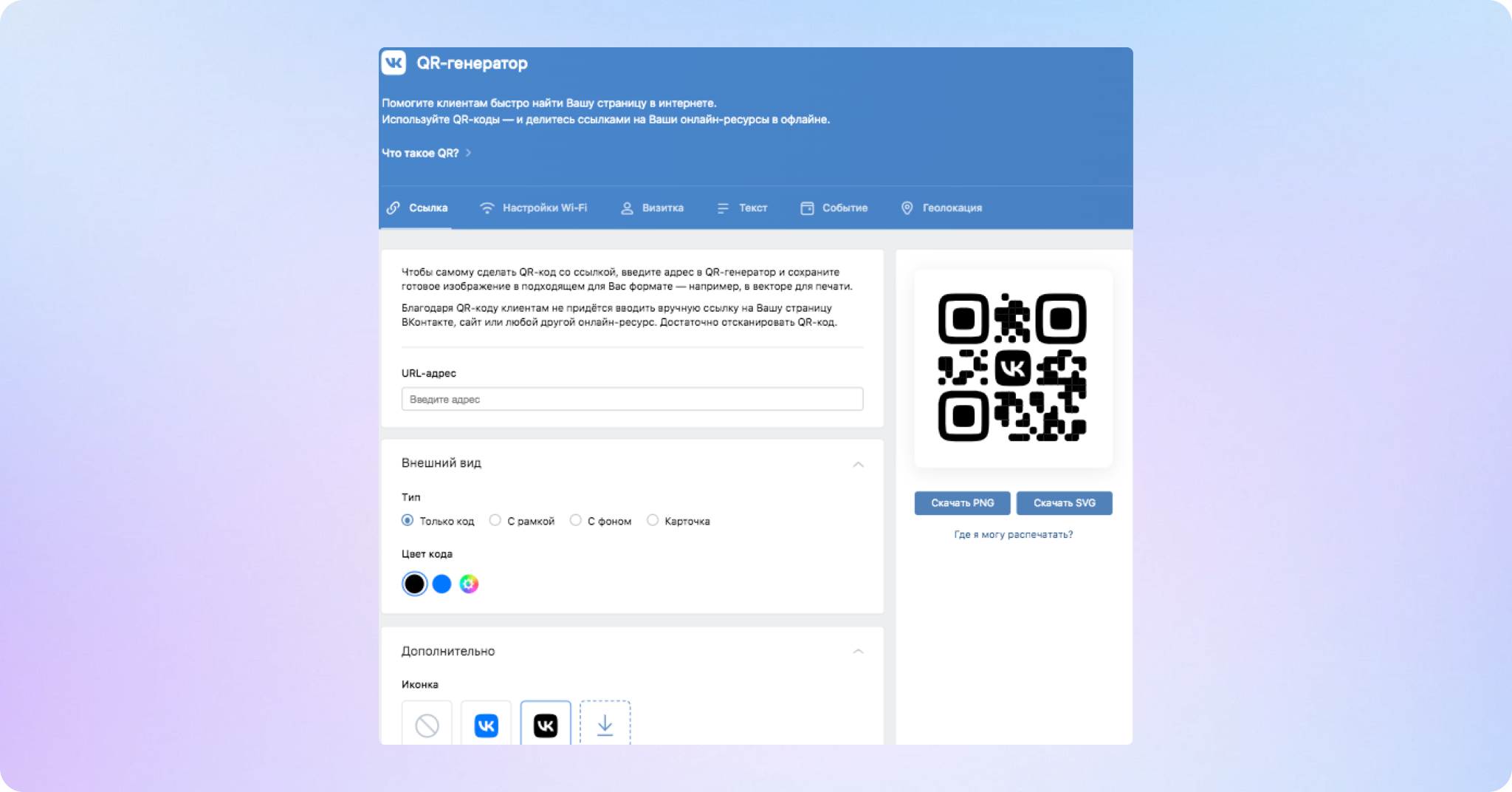Что можно закодировать: ссылку, настройки Wi-Fi, визитку, текст, событие, геолокацию.