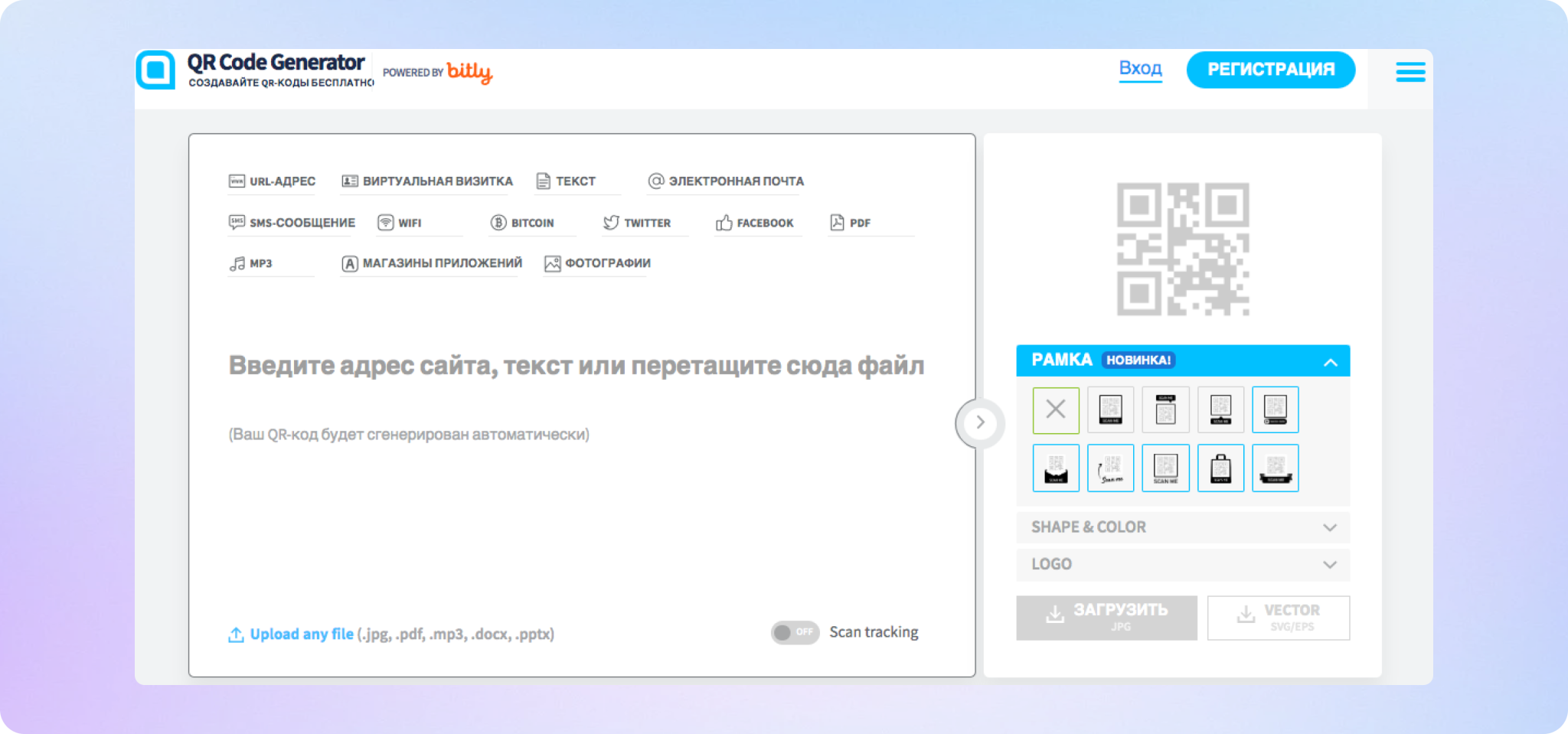 Сервис с понятным интерфейсом на русском языке. Имеет широкий функционал для различных ситуаций: может зашифровать как обычную ссылку, так и полноценное видео. Можно изменять дизайн по собственному усмотрению или с помощью шаблонов, а также создать динамический QR-код.