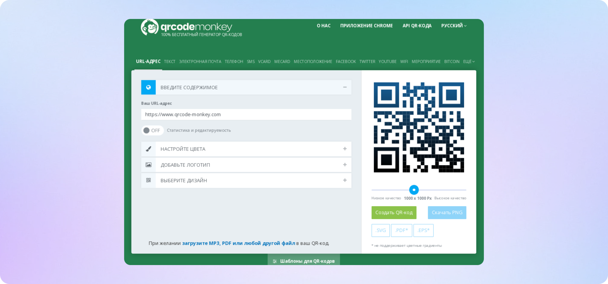 Лёгкий и интуитивно понятный сервис для генерации QR-кодов на русском языке. Пользователи могут менять цветовую палитру, добавлять рамки, фоны, текстовые элементы и даже интегрировать логотип для персонализации кода.