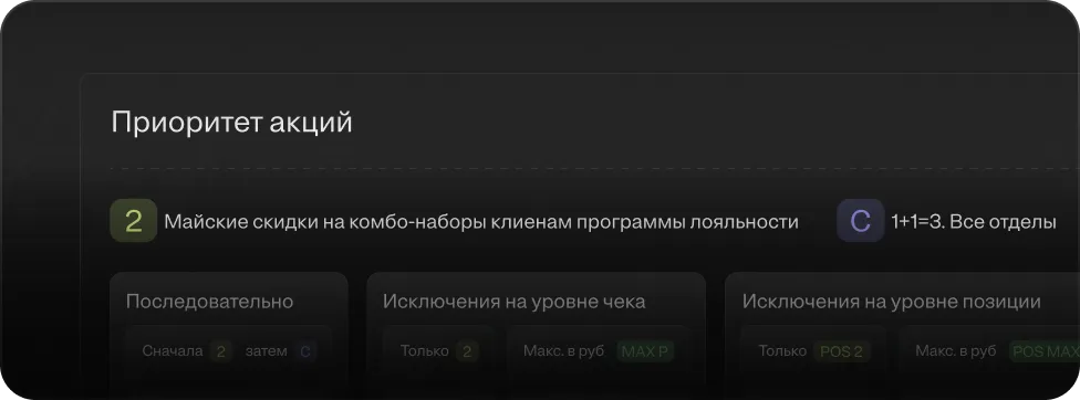 Управляйте приоритизацией акций и ценовой политикой, чтобы избежать пересечений и обеспечить максимальную выгоду для бизнеса.