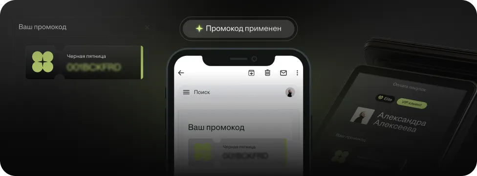 Одна настройка — и промоакция работает на кассе, сайте, в приложении и коммуникациях. Баннеры, бейджи и промоценники — автоматически на всех экранах.