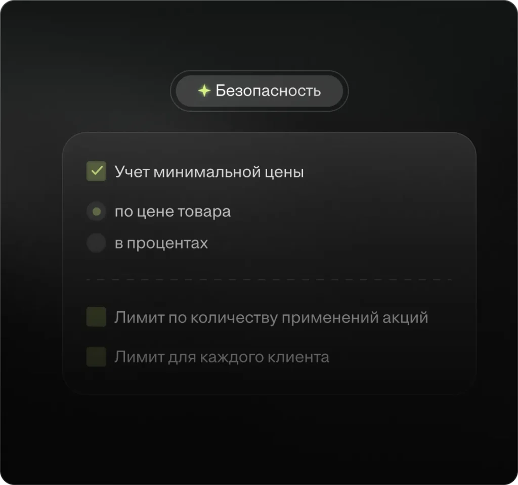 Настраивайте лимиты по сумме скидок и количеству применений, контролируйте пересечения акций и используйте защиту от фрода.