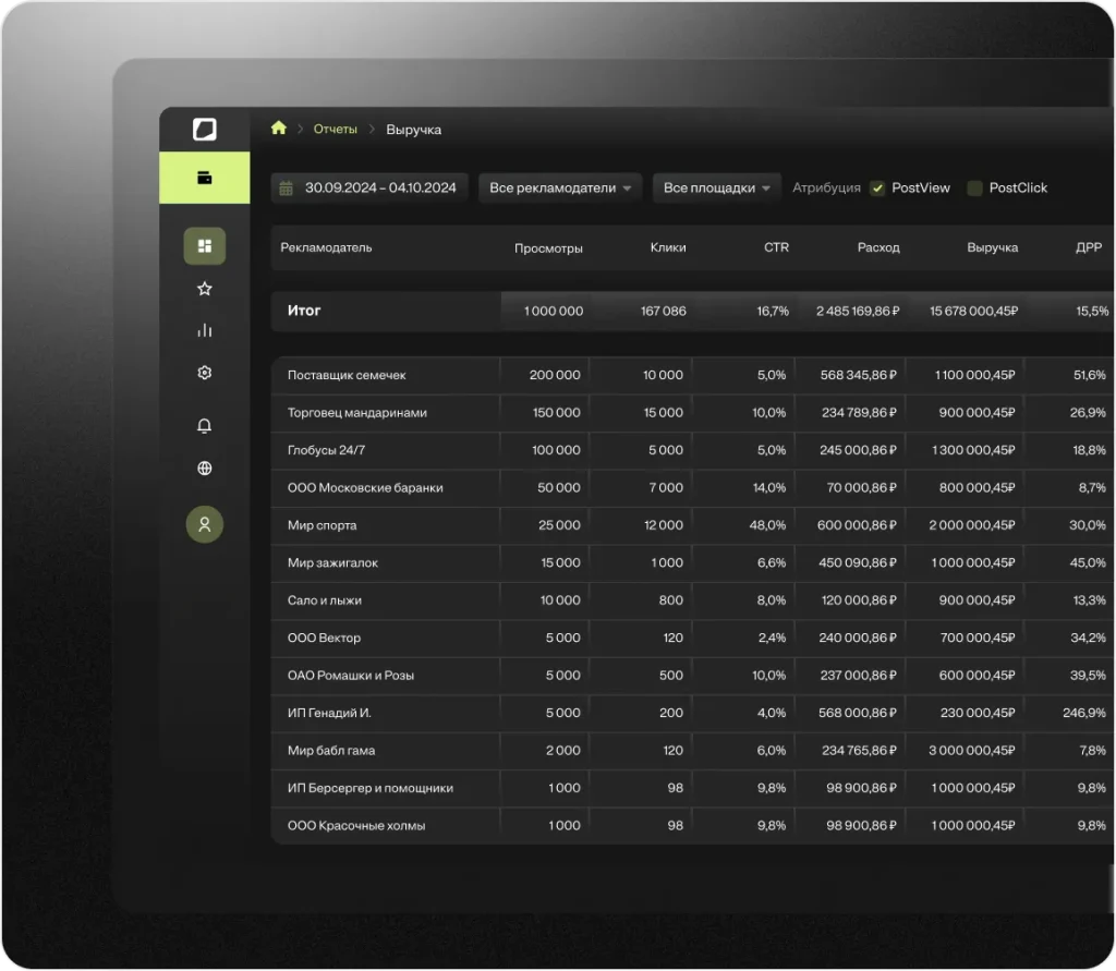 Отслеживайте показы, CTR и выручку в разрезе рекламодателей, кампаний, периодов, форматов рекламы или страниц.