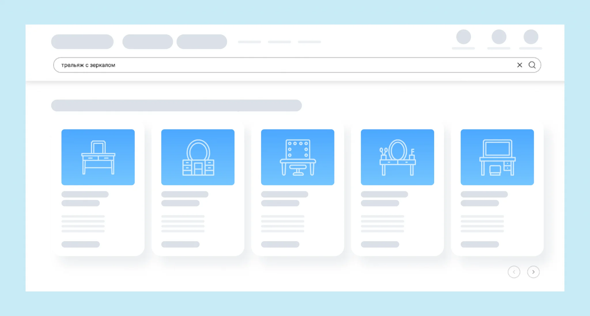 Пользователь ищет «трельяж с зеркалом». Нейросеть «понимает» смысл поискового запроса и объединяет его с другими фразами: «трельяж», «туалетный столик с зеркалом», «туалетный столик», «стол с зеркалом». Так алгоритм строит наиболее релевантные рекомендации к редкому запросу.