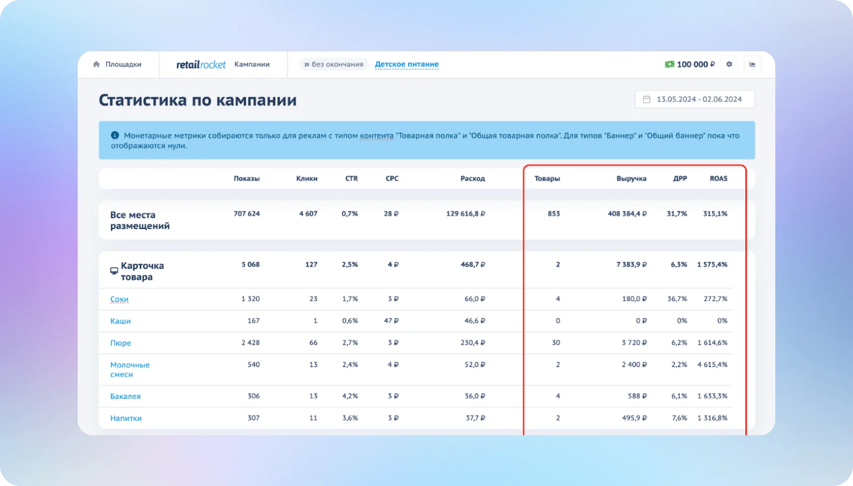 Рекламодатели онлайн-площадки получили доступ к более глубокому анализу рекламных кампаний. Расширенная статистика доступна и онлайн-площадке при запуске рекламных кампаний для продвижения СТМ или других товаров из собственного ассортимента.
